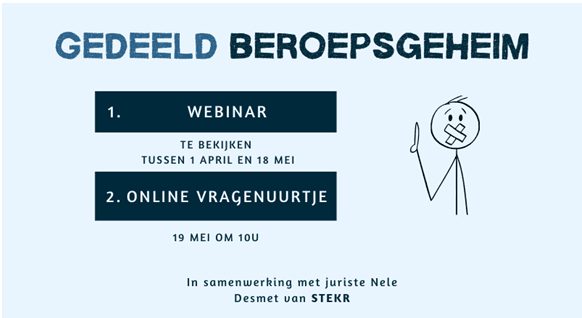 Wie de Webinar heeft bekeken, kan deelnemen aan het online vragenuurtje nadien. Verduidelijkende en verdiepende vragen rond het gedeeld beroepsgeheim (bv. naar aanleiding van een casus) kunnen gesteld worden op 19 mei om 10u. Jurist Nele Desmet biedt tijdens het vragenuurtje informatie, advies en bijstand.